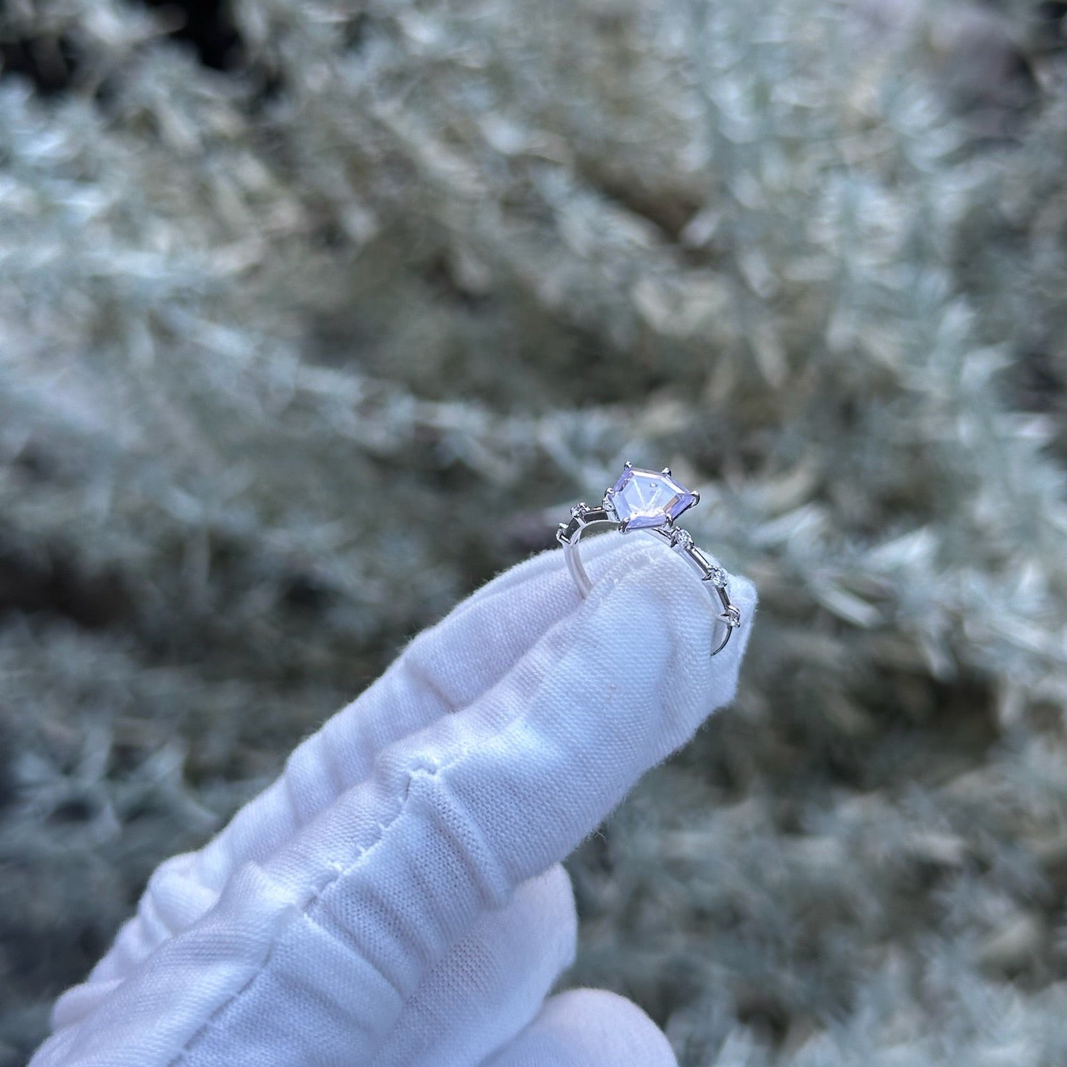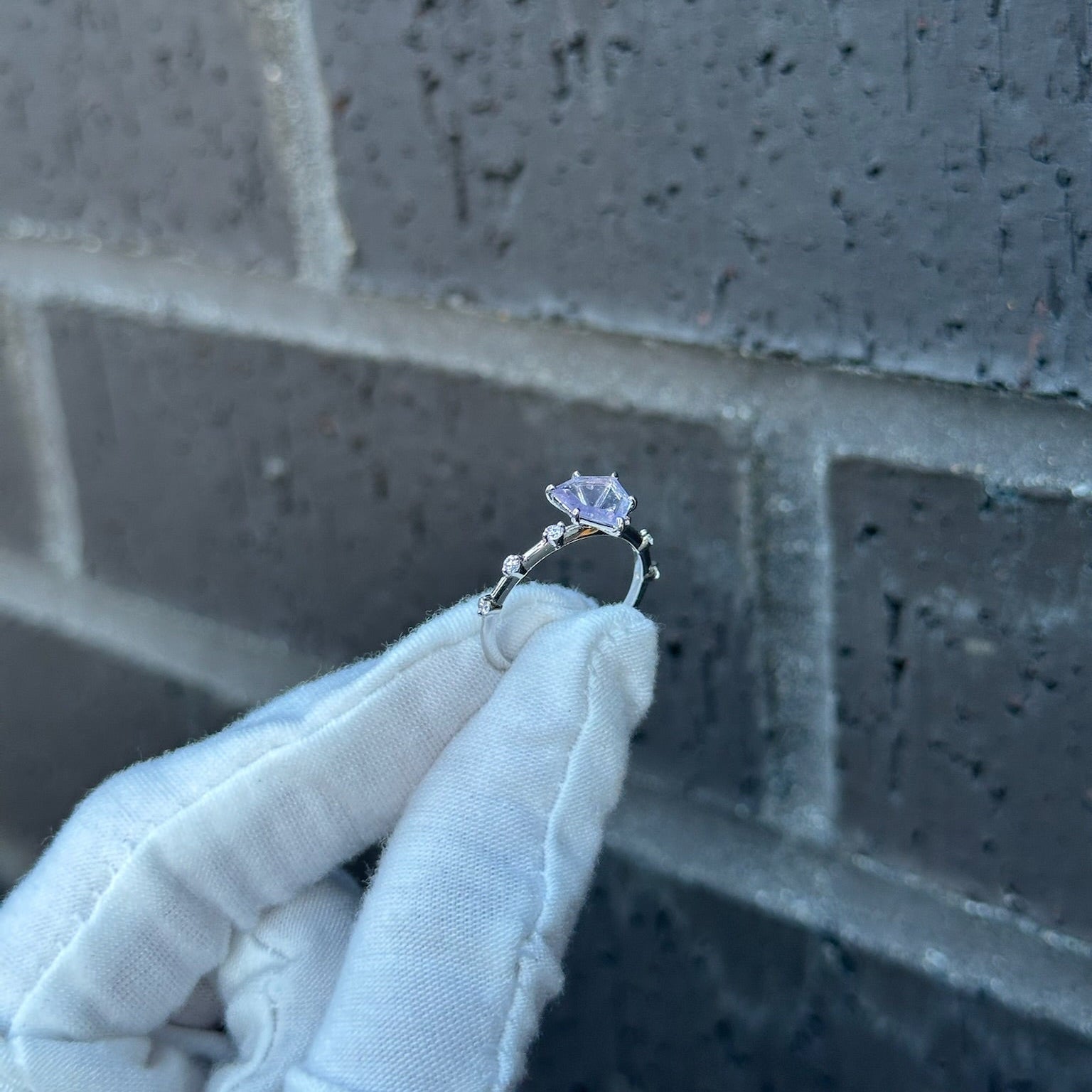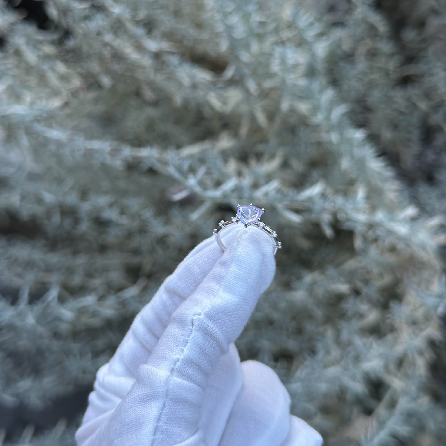 Regular price $1,572.00 USD Save Liquid error (snippets/product-template line 135): Computation results in '-Infinity'%Elevate your elegance with this exquisite 14k white gold ring, showcasing a stunning shield cut amethyst that radiates sophistication. Set alongside natural diamond G VS1 accent stones, this piece sparkles with unparalleled brilliance. The delicate 1.5mm band complements the center stone, creating a harmonious balance of luxury and modern design. Perfect for any occasion, this ring is a timeless addition to your jewelry collection.